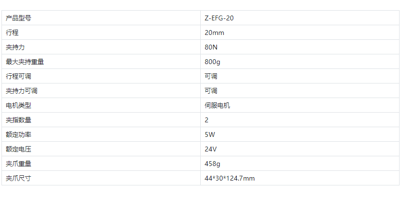 答:可以,20mm 都是指有效行程,而非被夾取物體的尺寸,被夾取對象最大到最小的尺寸差在 20mm 之內的,都可以用 Z-EFG-20 來夾取。
