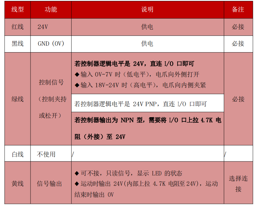 1. 白線不接的情況下,夾持力由電位器控制,白線連接時,夾持力由白線信號控制