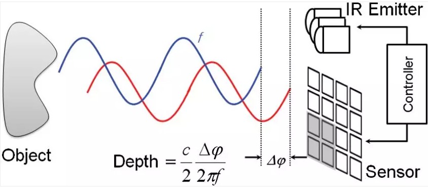 TOF是Time Of Flight的簡寫,它的原理是通過給目標物連續發送光脈沖,然后用傳感器接收從物體返回的光,通過探測光脈沖的飛行時間來得到目標物距離。