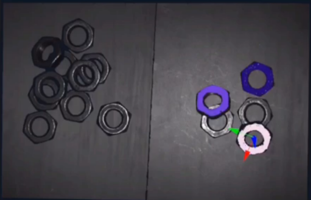 顯揚(yáng)科技的3D相機(jī)HY-M5首先對產(chǎn)品進(jìn)行拍攝三維點(diǎn)云,通過HYPick軟件對產(chǎn)品進(jìn)行分析定位,將產(chǎn)品的坐標(biāo)數(shù)據(jù)發(fā)送到機(jī)器人上。由3D視覺系統(tǒng)引導(dǎo)機(jī)器人準(zhǔn)確地抓取螺母,并將其放置在需要的位置。顯揚(yáng)科技的3D相機(jī)不僅可以對不同大小的螺母識別抓取,還可以對雜亂無章的螺母進(jìn)行準(zhǔn)確分揀。