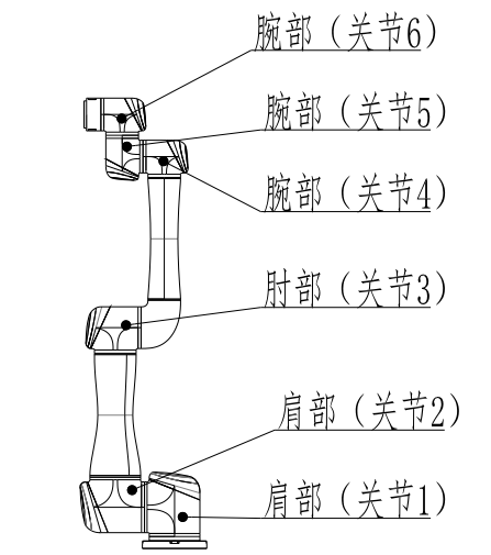 基座?于機器人本體和底座連接,?具端?于機器人與?具連接。肩部和肘部之間以及肘部和腕部之間采?臂管連接。通過示教器操作界?或拖動示教功能,?戶可以控制各個關節轉動,使機器人末端?具移動到不同的位姿。