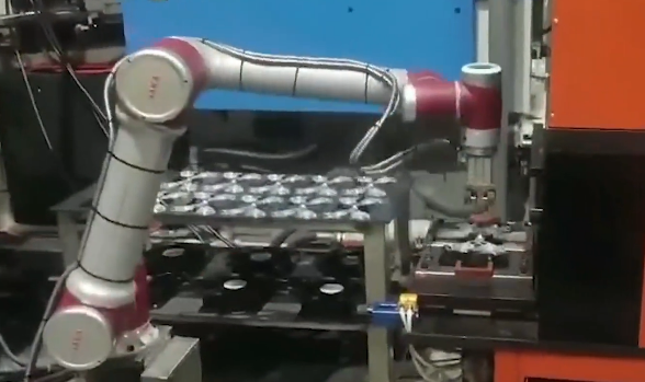 三軸機(jī)械臂將零部件壓鑄成型后從壓鑄機(jī)取出,JAKA Zu 7協(xié)作機(jī)器人對(duì)接三軸機(jī)械手拿到產(chǎn)品,放入冷卻工作臺(tái),然后將冷卻好的產(chǎn)品放入沖床進(jìn)行切除料頭,出成品。僅需12S就可以完成一組產(chǎn)品冷卻與沖床上下料動(dòng)作,效率得到了很大的提升。