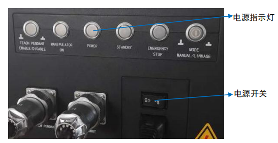 必須開啟控制柜才能給遨博機器人系統上電,把電源電纜品字插頭插到工頻交流電源插座上,然后把電源開關從 OFF 按至 ON 狀態,電源指示燈亮。機器人系統上電成功。