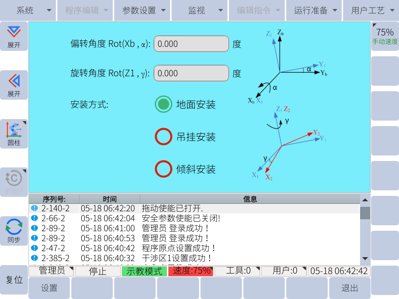 一旦示教器通電,報(bào)警 LED 指示燈將亮起。要清除它,找到示教器屏幕左下方的警報(bào)/復(fù)位按鈕,然后按清除警報(bào)。清除警報(bào)后,設(shè)置機(jī)器人的安裝設(shè)置。