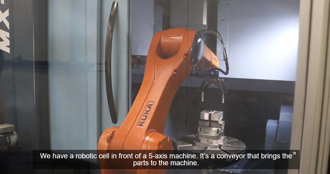 Précinov 在他們的 5 軸 CNC 機床前安裝了一個機器人單元。機器人將零件放在傳送帶上并將其放入機器中。如果需要,它可以翻轉零件,并在加工結束時將其取出。它基本上完成操作員的工作,而 Précinov 則聘請有資格從事完整生產設置的機械師。