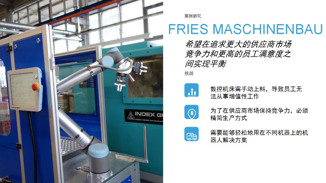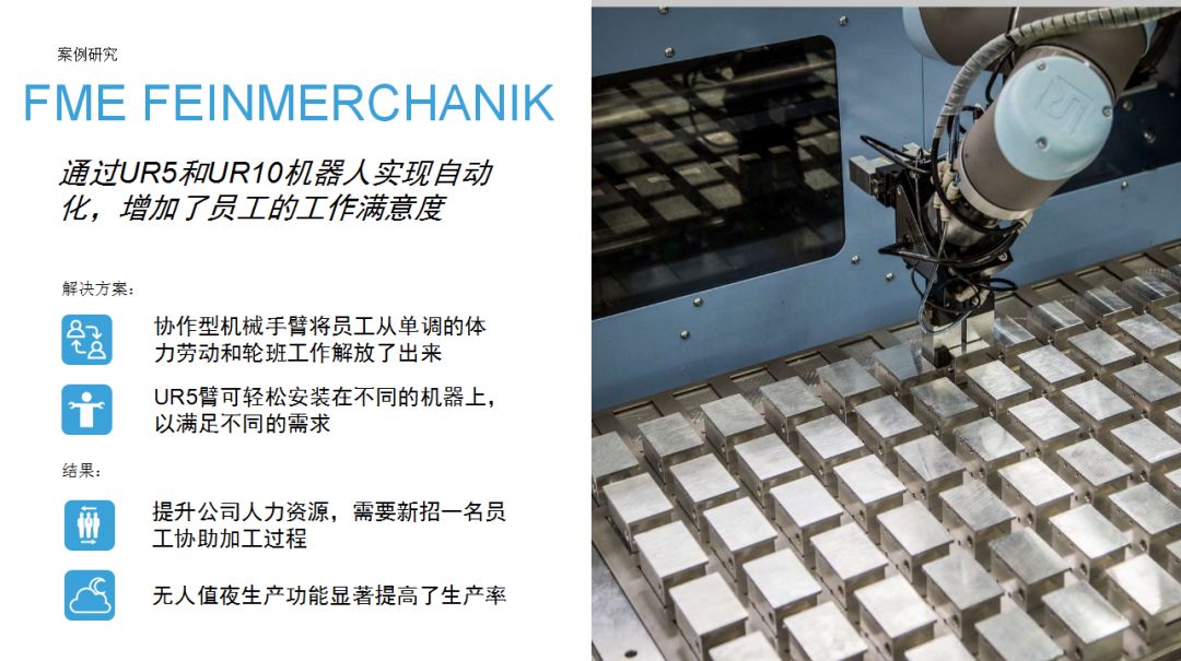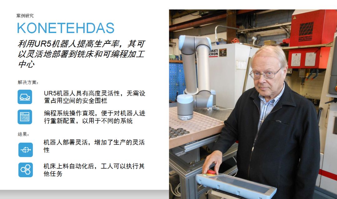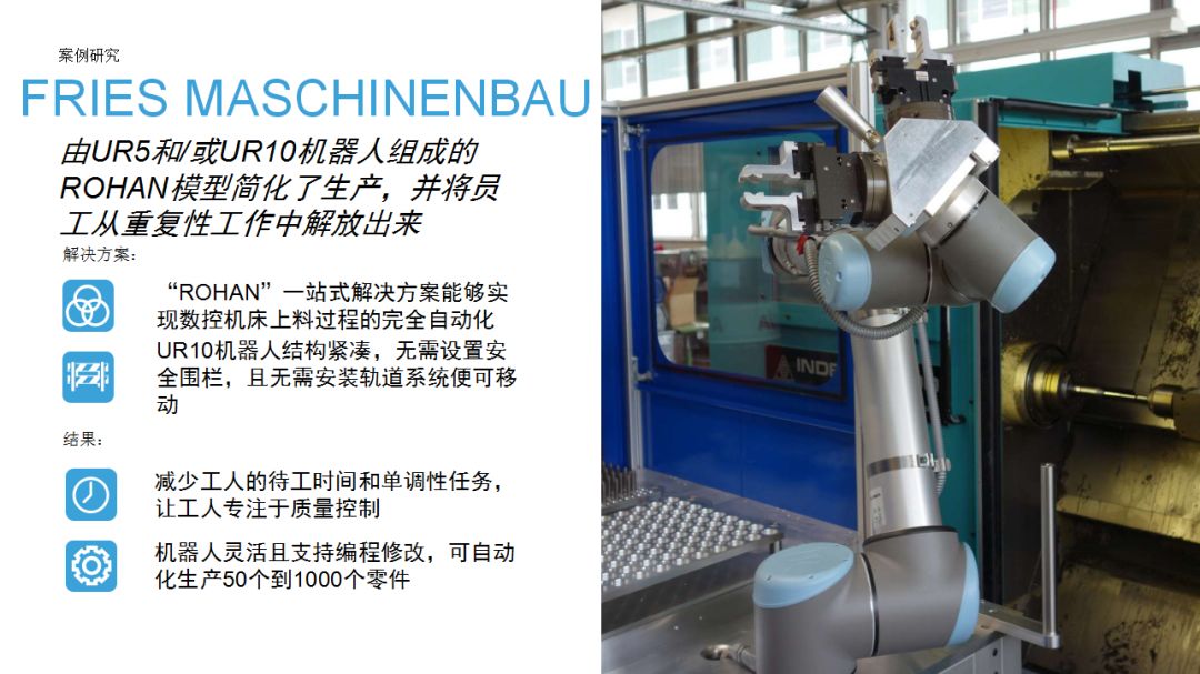 UR機(jī)器人為企業(yè)提供了一種思路:相比傳統(tǒng)工業(yè)機(jī)器人,協(xié)作機(jī)器人成本較低,占地空間小,導(dǎo)入現(xiàn)有工作流程時(shí)無需對(duì)產(chǎn)線進(jìn)行復(fù)雜和昂貴的重新部署,項(xiàng)目集成周期短。優(yōu)傲機(jī)器人始終堅(jiān)信,協(xié)作機(jī)器人擁有巨大的潛力,能夠在廣泛的應(yīng)用場(chǎng)景下協(xié)助人類工作。本期內(nèi)容中,協(xié)作機(jī)器人用于金屬加工和機(jī)床上下料,希望這些案例能夠?yàn)橛蓄愃茍?chǎng)景的用戶提供借鑒。