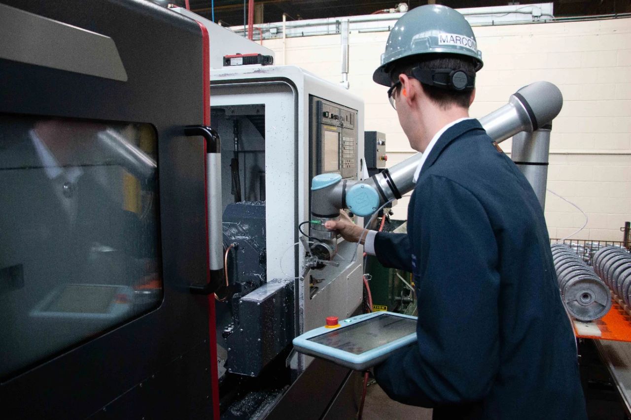 RCM Industries在兩個(gè)相同的工作單元里部署了優(yōu)傲機(jī)器人。協(xié)作機(jī)器人在每個(gè)工作單元里分別控制兩臺(tái)雙主軸CNC車(chē)床,并以同樣的周期運(yùn)作。引入?yún)f(xié)作機(jī)器人后,RCM Industries只需要一位巡檢員查看這兩個(gè)工作單元,減少人員接觸。