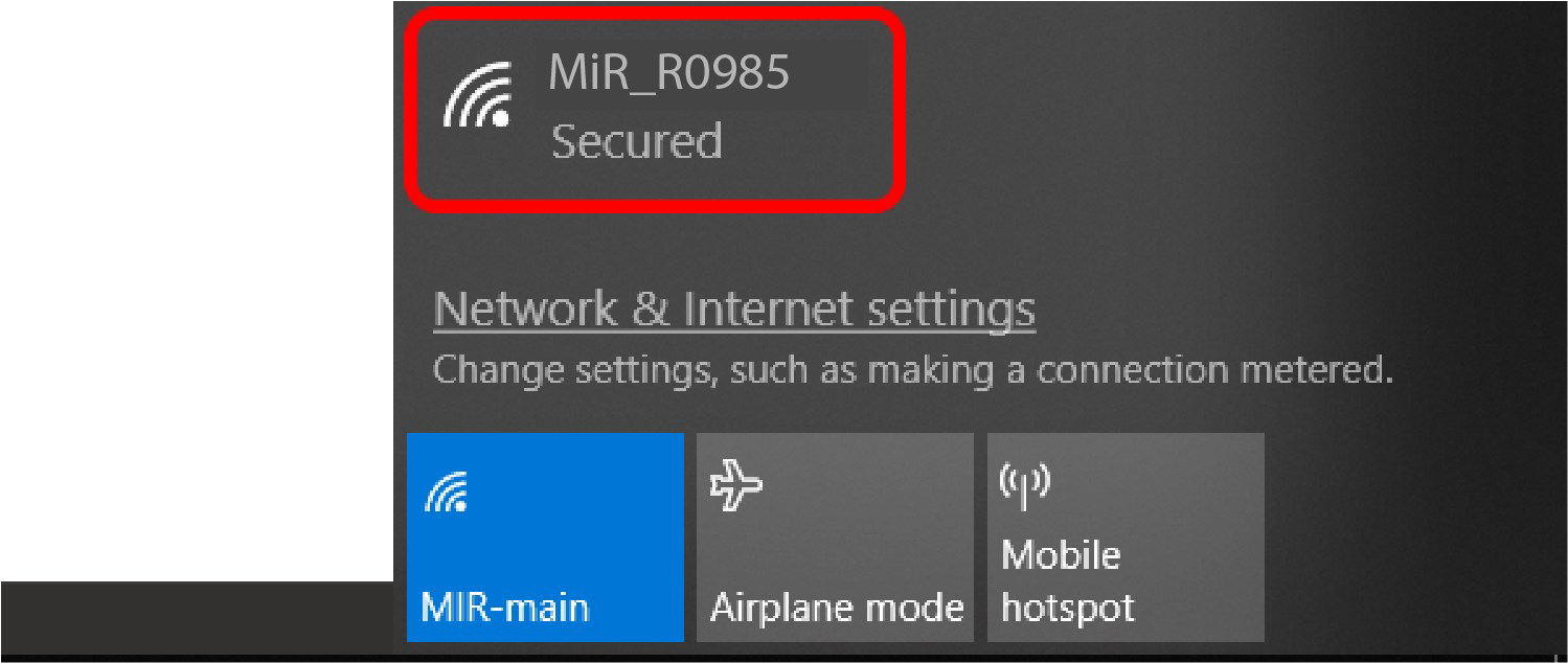 1. 使用個(gè)人電腦、平板電腦或手機(jī)連接機(jī)器人的WiFi 接入點(diǎn)。接入點(diǎn)名稱格式如下:MiR_RXXXX。