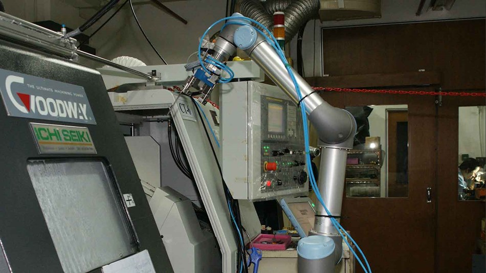 為了降低生產成本,A公司在電腦數控機床上裝上了機械臂。如此以來,就可以一人兼顧兩臺數控機床。