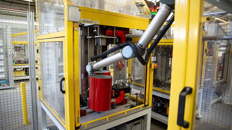 由于UR5的順利實(shí)施和購置成本的快速攤銷,協(xié)作機(jī)器人在不到一年的時(shí)間內(nèi)就收回了投資。Hailo委托其兩個(gè)制造垃圾箱的工廠開發(fā)了另外兩個(gè)UR協(xié)作機(jī)器人應(yīng)用程序。在工廠中,每臺(tái)UR10和一臺(tái)UR10e分別處理涂漆的鈑金圓柱體。這兩個(gè)協(xié)作機(jī)器人用專門為Hailo設(shè)計(jì)的雙抓手撿起空白。他們將它們放置在模切機(jī)中,在模切機(jī)中在圓柱體上沖壓出孔。MS的所有者兼董事總經(jīng)理MarcStraußfeld解釋說,這兩個(gè)應(yīng)用程序的實(shí)施具有挑戰(zhàn)性:“我們必須協(xié)調(diào)多臺(tái)模切機(jī)的進(jìn)料,并確保在處理過程中不會(huì)損壞鈑金零件的噴漆。”電子產(chǎn)品。