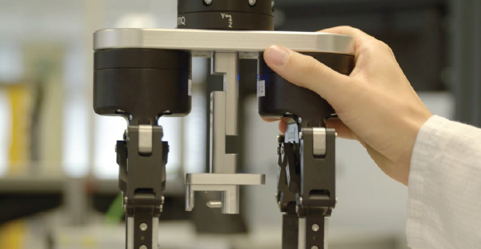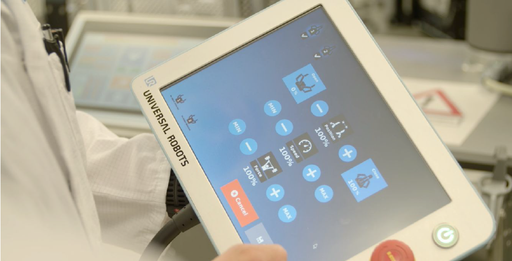 整個質(zhì)量測試應(yīng)用程序均由人機界面控制,獨立于Universal Robots示教器。 機器人首先接收到信號,以便同時使用兩個Robotiq 2F-85自適應(yīng)抓爪來管理計算機。 然后,機器人將讀取計算機的條形碼。 Robotiq FT 300可幫助放置計算機以讀取條形碼。 完成此操作后,將計算機放置在質(zhì)量測試單元中。 Grippers / FT 300組合每次都能確保完全相同的定位。 然后組合桿關(guān)閉杠桿,測試階段開始。 測試完成后,除條形碼讀取外,將反向執(zhí)行相同的過程。