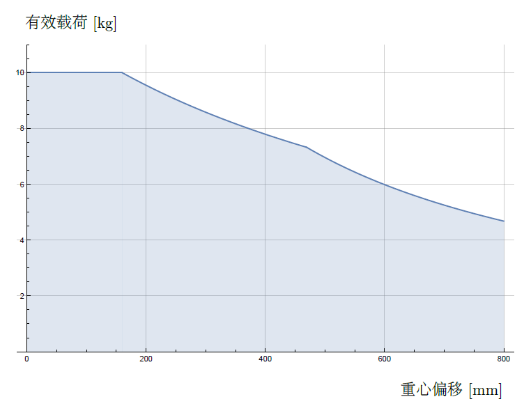 圖4.5 UR10 機器手臂最大允許有效載荷與重心偏移之間的關系。