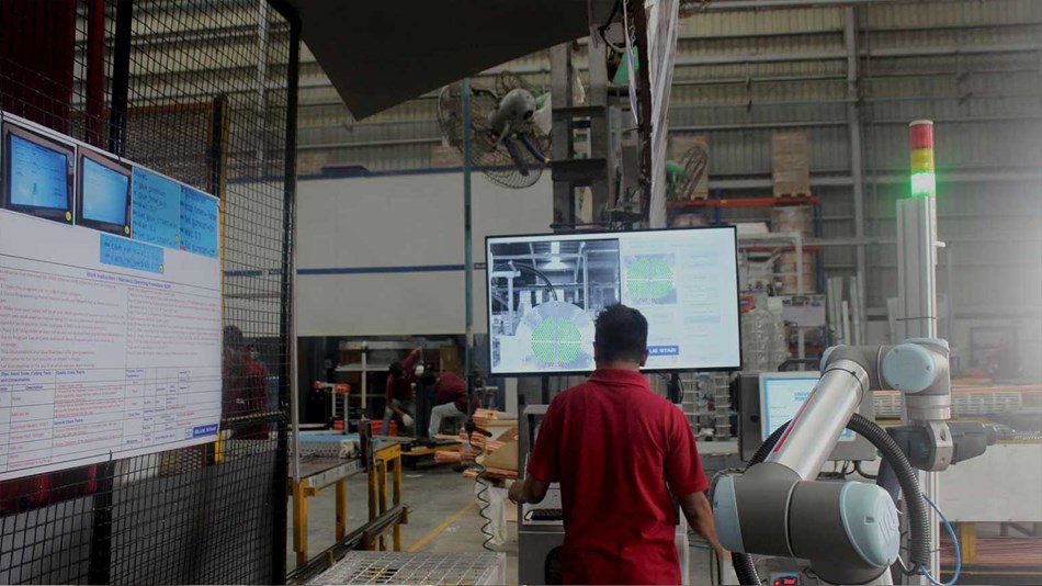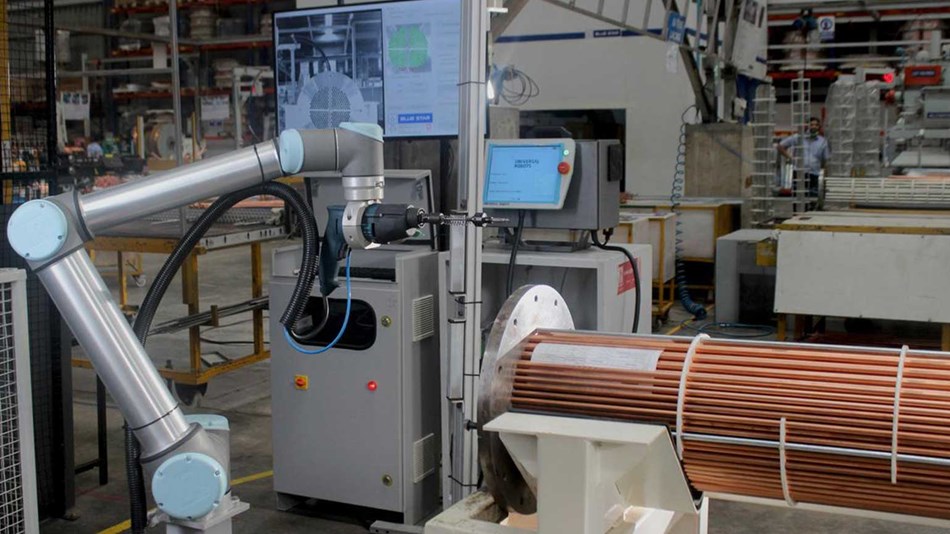 L公司部署了UR10協(xié)作機器人來處理銅管擴展任務(wù)。攝像機與視覺系統(tǒng)集成在一起,拍攝了管殼式熱交換器的照片,并檢測了銅管的輪廓。還對協(xié)作機器人進(jìn)行了編程,使其每5個循環(huán)將擴展工具浸入清潔劑和潤滑劑中一次。