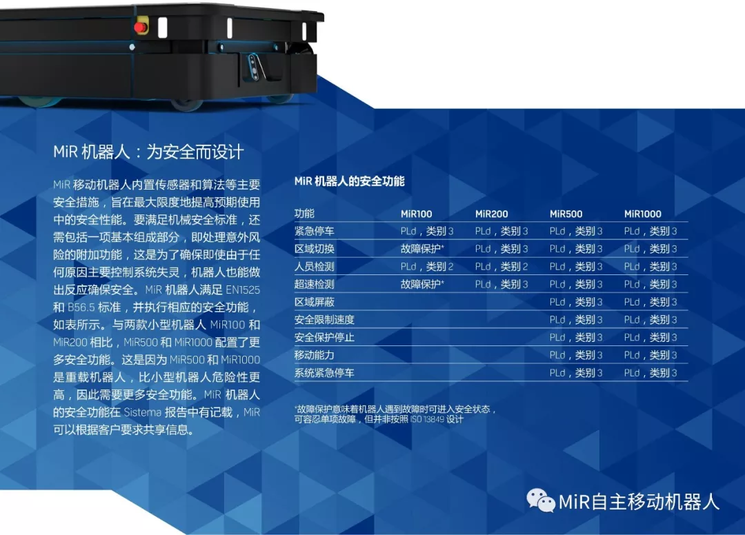 MiR機器人滿足EN 1525和美國相應(yīng)標準ANSI / ITSDF標準B56.5-2012,產(chǎn)品設(shè)計面向未來標準,如ISO/FDIS 3691-4、ISO/FDIS 10218、RIA 15:08以及UL 3100,配備各類相關(guān)安全功能,以確保即使主要安全功能發(fā)生故障,機器人也能做出反應(yīng)確保安全。MiR機器人的安全功能在Sistema報告中有記載,MiR可以根據(jù)客戶要求共享信息。