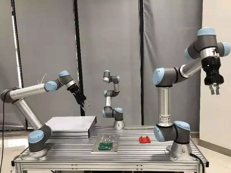1、機器人1,UR5 CB系列,使用ROBOTIQ 2指140自適應夾爪在ROBOTIQ 腕部相機的引導下,從上料工位自主夾持待加工PCB,并放置到定位工裝上,放置到定位工裝的時候使用FT300 6向量力傳感器實現裝配微調。