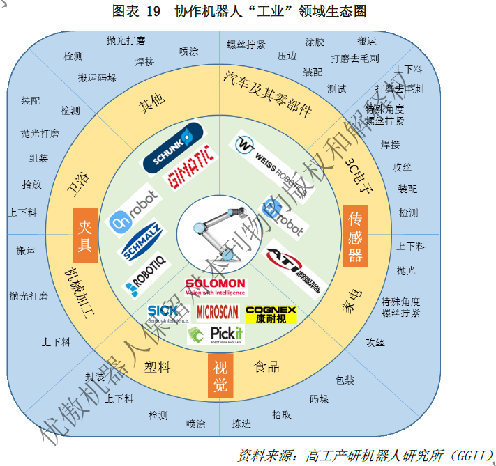 以安全、靈活的協(xié)作機(jī)器人為核心,根據(jù)需求各異的場(chǎng)景搭配不同的視覺模塊、末端執(zhí)行器、傳感器等周邊配套,滿足各式工業(yè)應(yīng)用領(lǐng)域的使用要求,提供即插即用的系統(tǒng)方案。協(xié)作機(jī)器人、應(yīng)用配套部件與工業(yè)終端企業(yè)之間共同構(gòu)建了一個(gè)“相互促進(jìn)、融合發(fā)展”的生態(tài)圈。