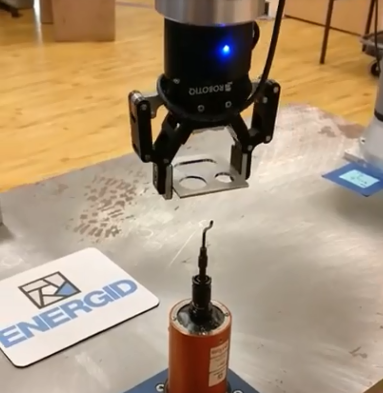 第一個(gè)演示中, ATI兼容去毛刺刀片(CDB) 固定在工作臺(tái)上。配備Robotiq 2F-85自適應(yīng)夾具的UR10e機(jī)器人,將金屬部件呈現(xiàn)給ATI CDB,以去除內(nèi)部特征。機(jī)器人相對(duì)于ATI CDB以恒定速度移動(dòng)零件。