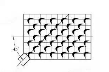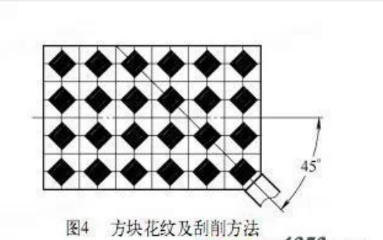 方塊花紋如圖4所示。刮花前要在工件表面用鉛筆劃出一定間距的方格。刮花時(shí),刀身平面中心線與工件表面縱向中心線成45°角,從工件的前面向后面進(jìn)行刮削。基本刮法是:采用直線刃(或大半徑圓弧刃)窄刮刀進(jìn)行短程推刮,刮出第一個(gè)方塊后,應(yīng)間隔一個(gè)方塊距離即空出一格再刮出第二個(gè)方塊。