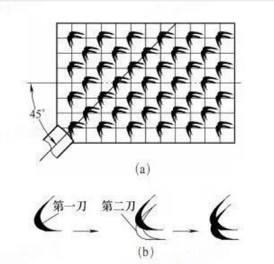 波浪花紋如圖5a所示。刮花前要在工件表面用鉛筆劃出一定間距的方格。刮花時(shí),刀身平面中心線要平行于工件表面縱向中心線,從工件的后面向前面進(jìn)行刮削。基本刮法是:采用豁口刮刀進(jìn)行刮削,選擇好落刀位置(一般選擇交點(diǎn)處),落刀后即向左側(cè)斜向移動(dòng)推刮,當(dāng)達(dá)到一定長(zhǎng)度時(shí)(一般選擇交點(diǎn)處)緊接著向右側(cè)斜向移動(dòng)推刮至一定位置后起刀,如圖5b所示。