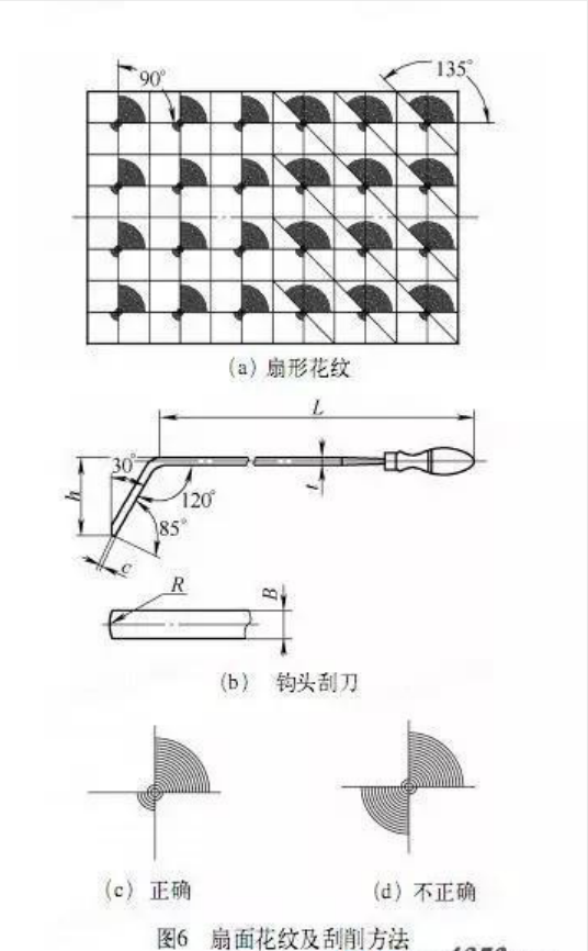 扇形花紋如圖6a所示。刮花前要在工件表面用鉛筆劃出一定間距的方格和角度線。刮削扇形花紋要采用鉤頭刮刀(如圖6b所示),要將刀刃右端磨鋒利,左端稍鈍一點(diǎn),刃線要平直。基本刮法是: